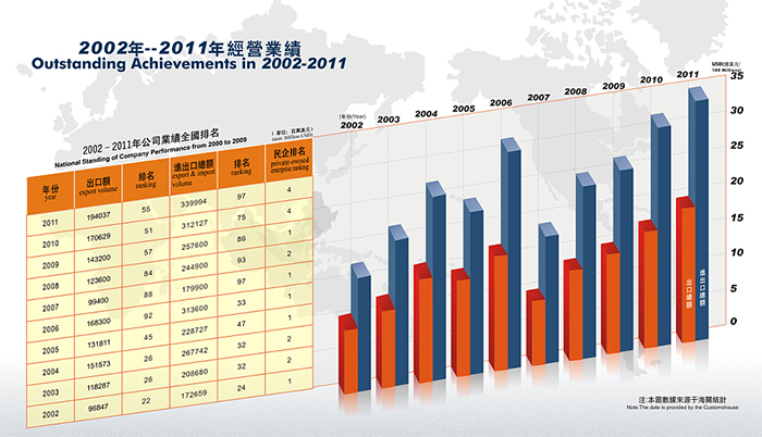 近年來(lái),公司發(fā)展勢(shì)頭良好, 2014年公司實(shí)際出口額達(dá)到10.5億美金,排名“2014中國(guó)出口200強(qiáng)”第192名,其中民營(yíng)企業(yè)排名第21名。公司先后獲得 “中國(guó)守合同重信用企業(yè)”、 “廣東省先進(jìn)集體”、“廣東省優(yōu)秀民營(yíng)企業(yè)”、“東莞市50強(qiáng)民營(yíng)企業(yè)”,“東莞市文明單位”等稱號(hào),公司被東莞市政府授予“東莞市50強(qiáng)民營(yíng)服務(wù)業(yè)企業(yè)”光榮稱號(hào),公司董事長(zhǎng)陳海生被授予“東莞市優(yōu)秀民營(yíng)企業(yè)家”光榮稱號(hào)。